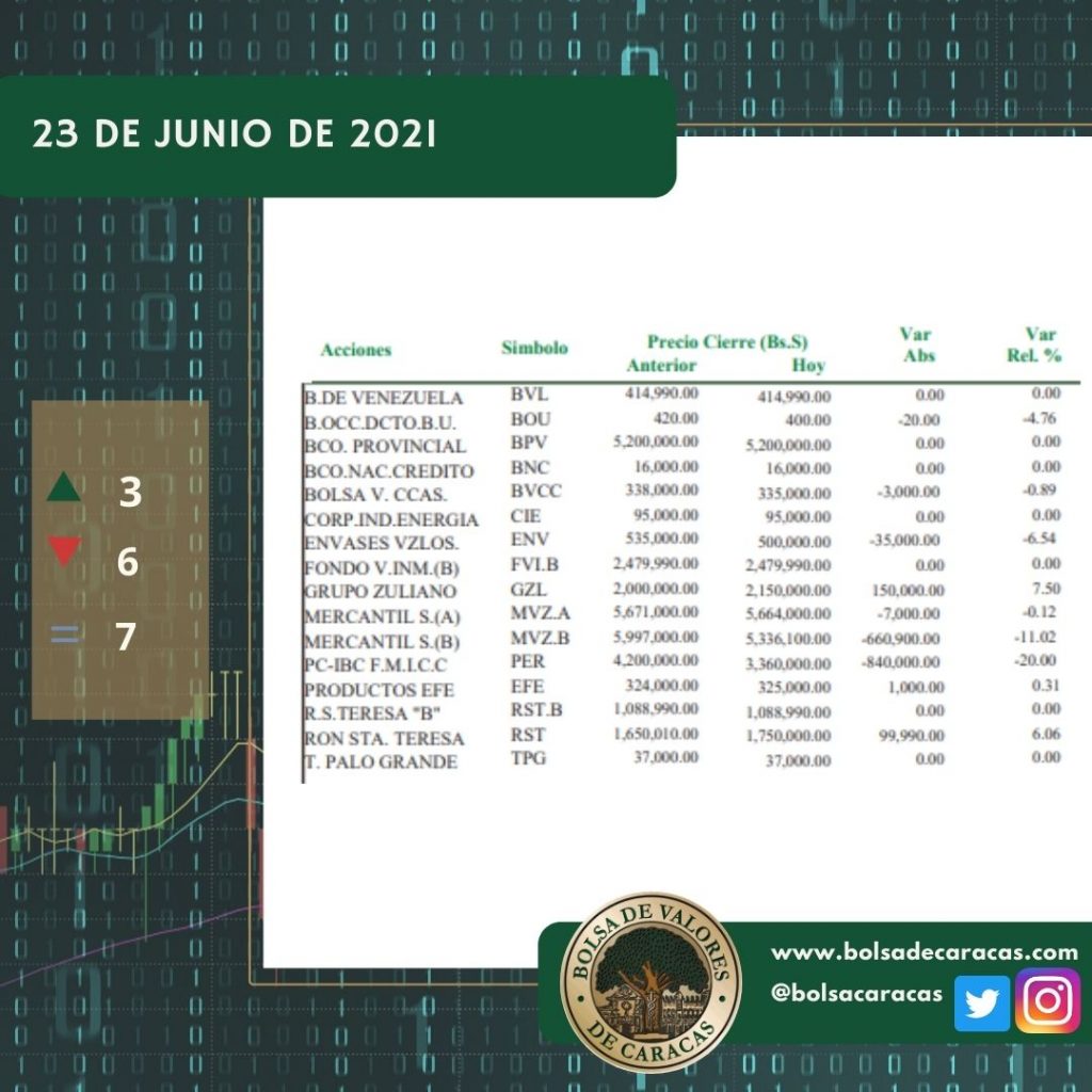 Se efectuaron 164 operaciones de compra/venta de acciones de las empresas inscritas en la pizarra de cotizaciones, en las cuales se transaron 6 millones 666 mil 960 acciones por 1.046.850.184.970 bolívares.