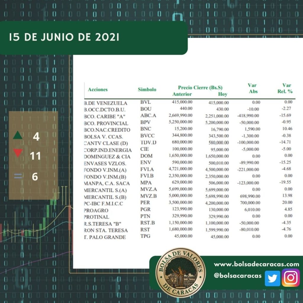 En el mercado a plazo se negociaron 20 mil 032 acciones por un monto de 19 mil 583 millones 353 mil 600 bolívares.