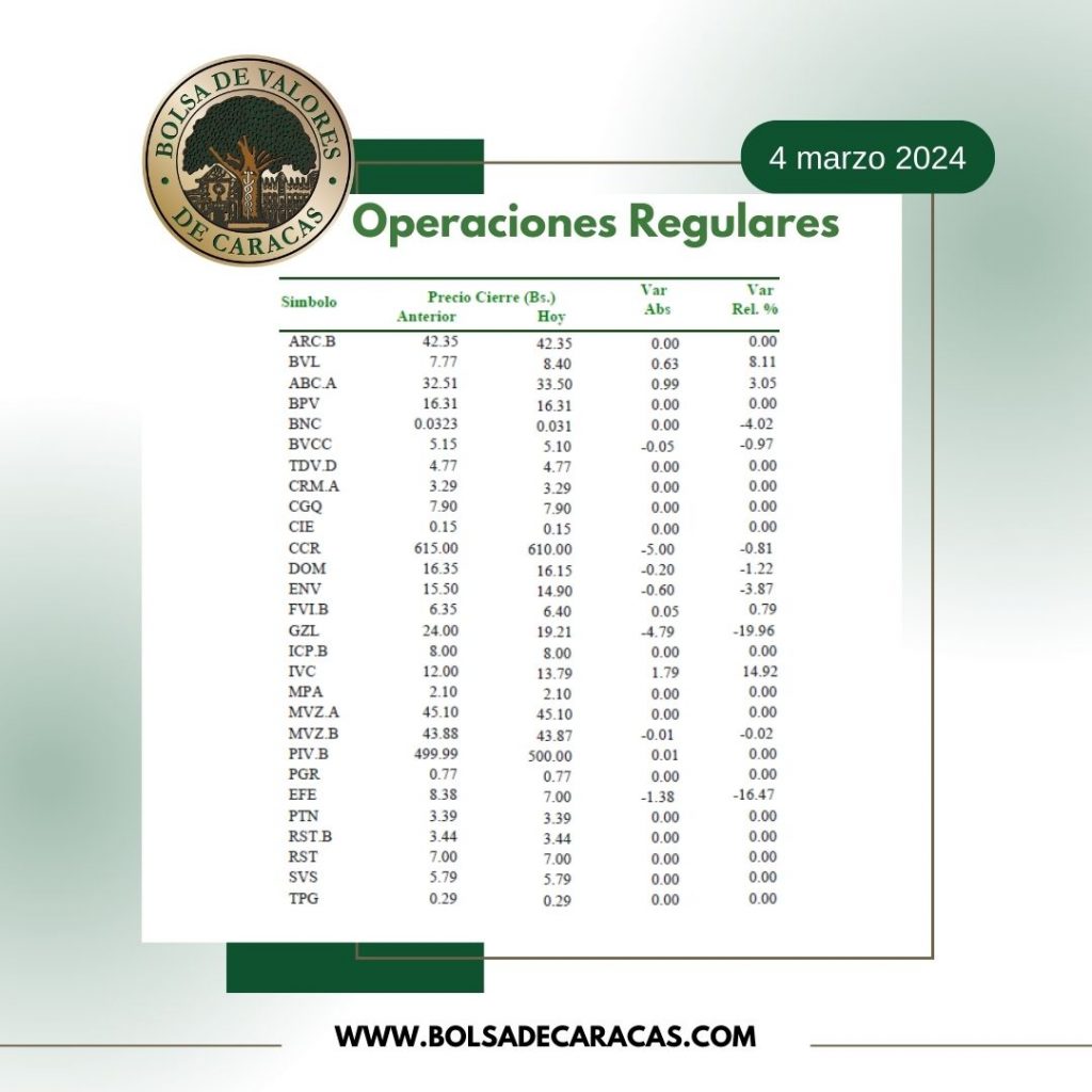 Se efectuaron 187 operaciones de compra/venta de acciones de las empresas inscritas en la pizarra de cotizaciones, en las cuales se transaron 1 millón 064 mil 553 acciones por 600 mil 499 bolívares.