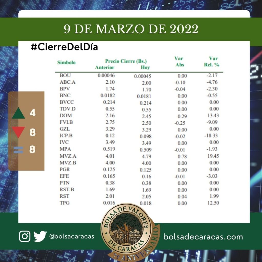 Se efectuaron 93 operaciones de compra/venta de acciones de las empresas inscritas en la pizarra de cotizaciones, en las cuales se transaron 321 mil 416 acciones por 23 mil 152 bolívares.
