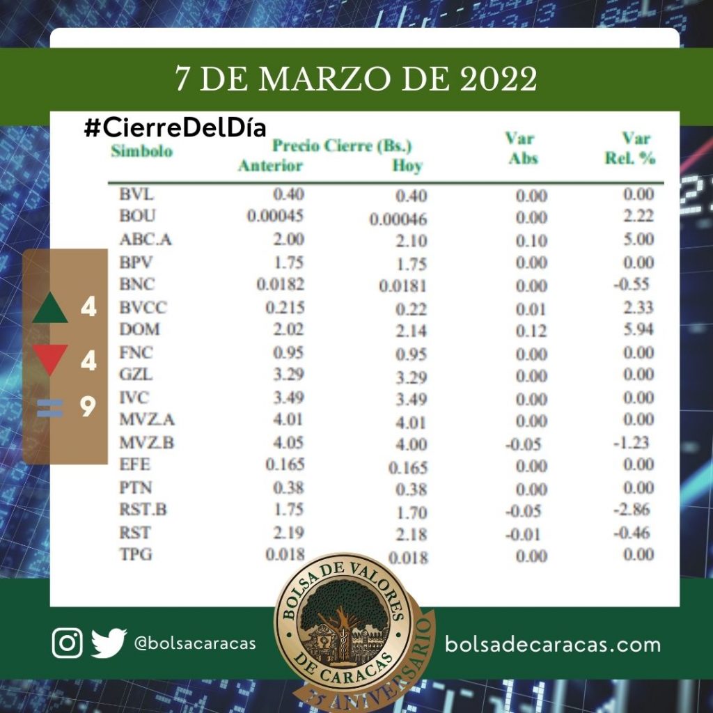 Se efectuaron 77 operaciones de compra/venta de acciones de las empresas inscritas en la pizarra de cotizaciones, en las cuales se transaron 6 millones 507 mil 932 acciones por 72 mil 042 bolívares.
