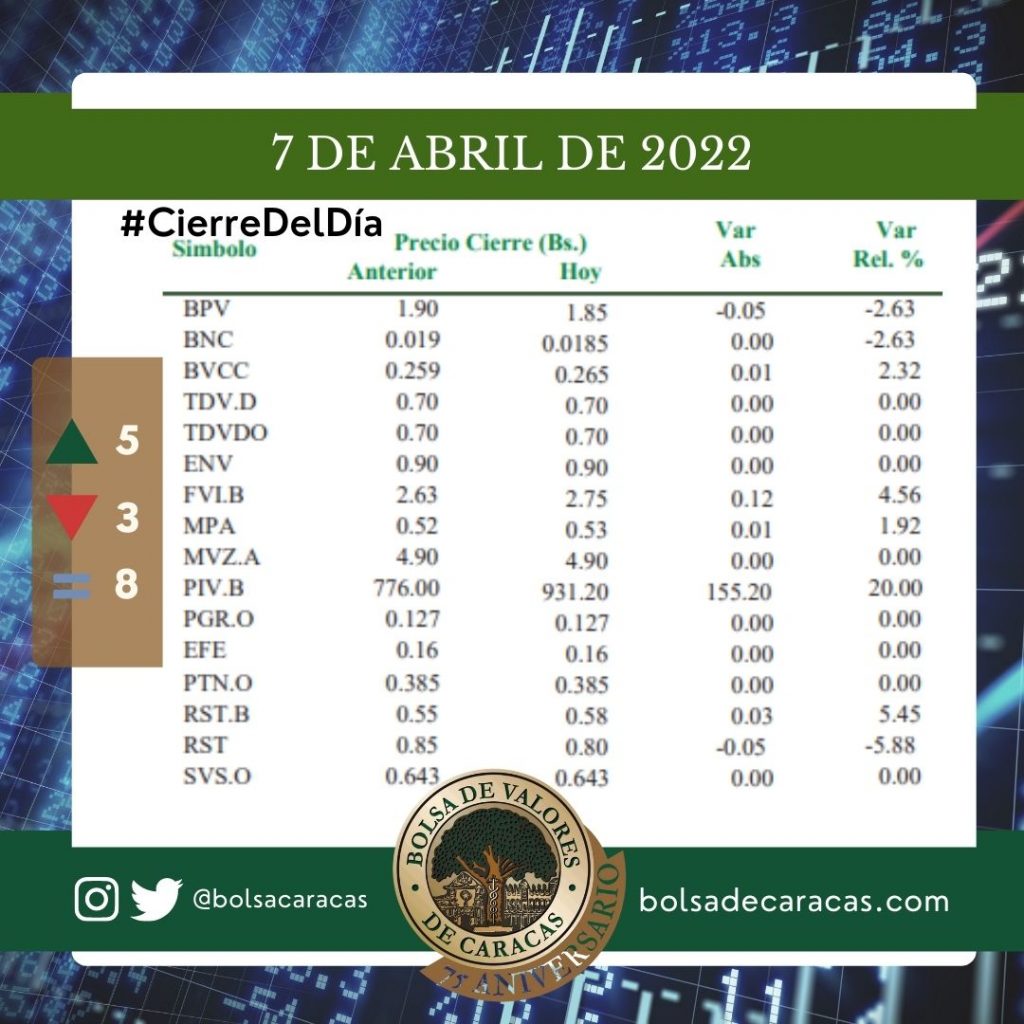 Se efectuaron 104 operaciones de compra/venta de acciones de las empresas inscritas en la pizarra de cotizaciones, en las cuales se transaron 2 millones 656 mil 123 acciones por 1 millón 756 mil 532 bolívares.