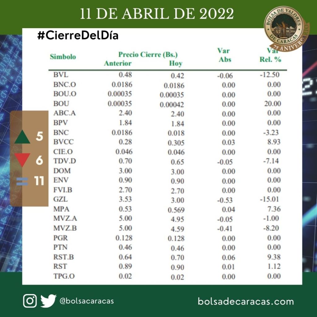 Se efectuaron 280 operaciones de compra/venta de acciones de las empresas inscritas en la pizarra de cotizaciones, en las cuales se transaron 83 millones 711 mil 577 acciones por 1 millón 442 mil 120 bolívares.