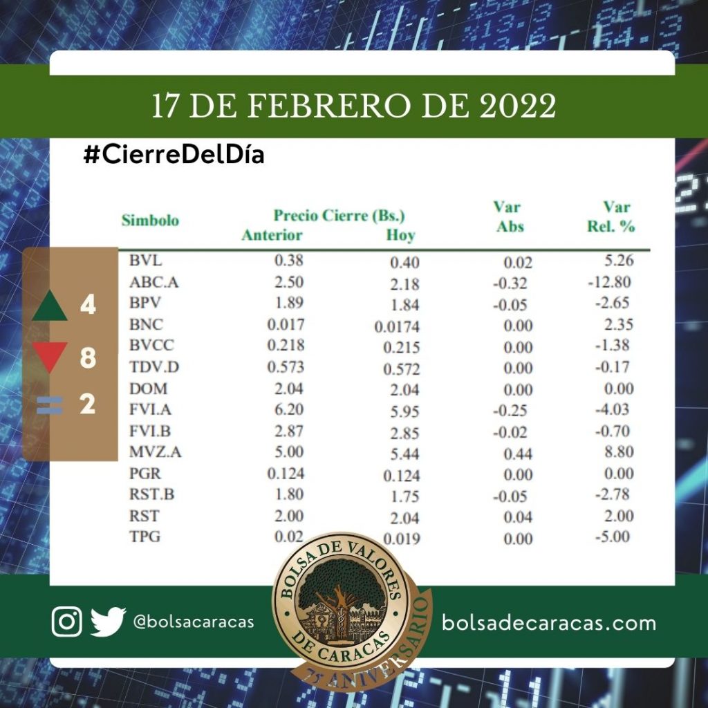 En el mercado a plazo se negociaron 24 mil 112 acciones por un monto de 27 mil 341 bolívares.