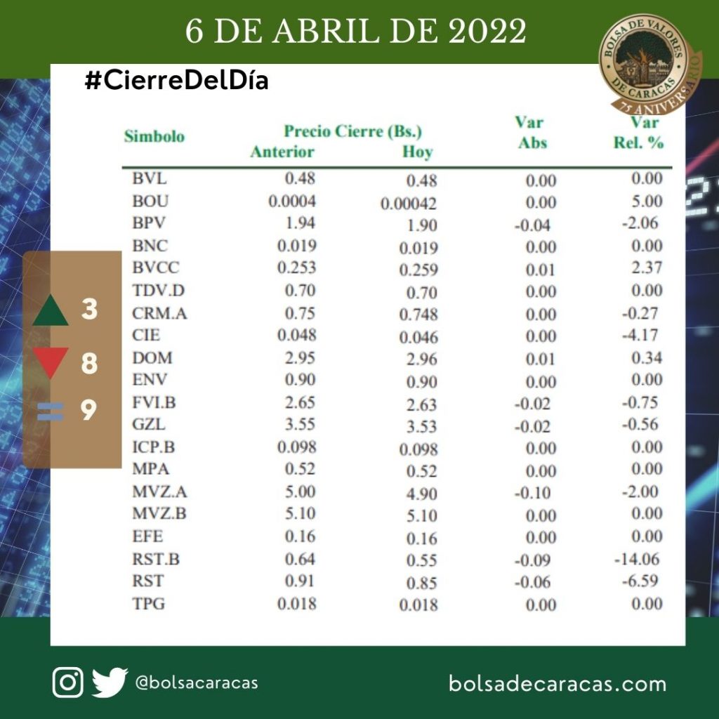 Se efectuaron 122 operaciones de compra/venta de acciones de las empresas inscritas en la pizarra de cotizaciones, en las cuales se transaron 2 millones 891 mil 789 acciones por 682 mil 463 bolívares.