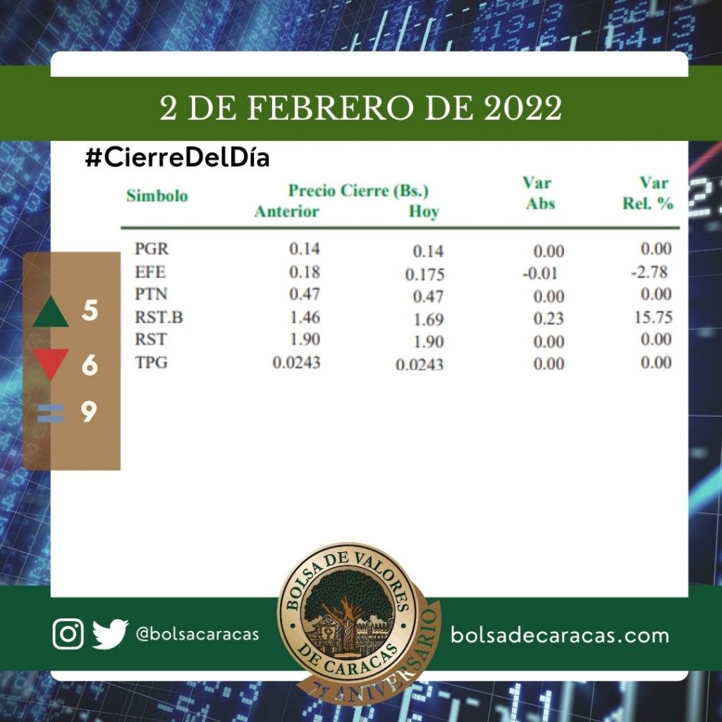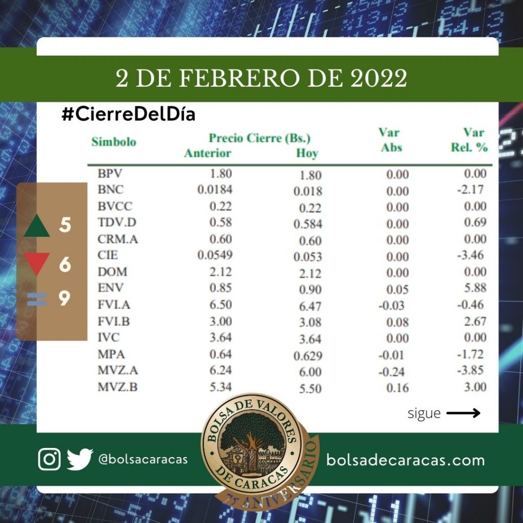 Se efectuaron 106 operaciones de compra/venta de acciones de las empresas inscritas en la pizarra de cotizaciones, en las cuales se transaron 83 mil 368 acciones por 33 mil 998 bolívares.