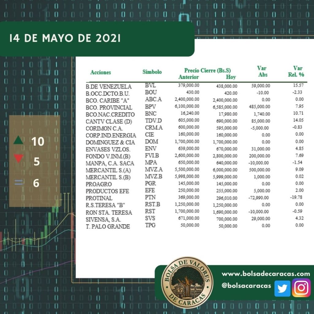 El índice principal de la Bolsa de Valores de Caracas, el IBC, culminó este viernes en 5.516,59 puntos con una variación de 284,86 puntos (+5,44%) con respecto a la sesión anterior.
