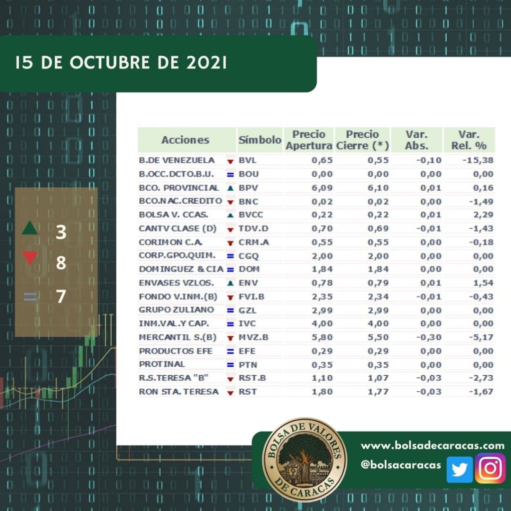 El índice principal de la Bolsa de Valores de Caracas, el IBC, culminó este viernes en 5.603,32 puntos con una variación de 47,03 puntos (-0,83%) con respecto a la sesión anterior.