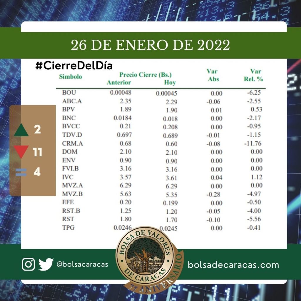 El índice principal de la Bolsa de Valores de Caracas, el IBC, culminó este miércoles en 5.614,30 puntos con una variación de 104,51 puntos (-1,83%) con respecto a la sesión anterior.