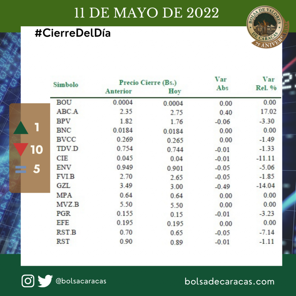 Se efectuaron 70 operaciones de compra/venta de acciones de las empresas inscritas en la pizarra de cotizaciones, en las cuales se transaron 334 mil 162 acciones por 103 mil 761 bolívares.