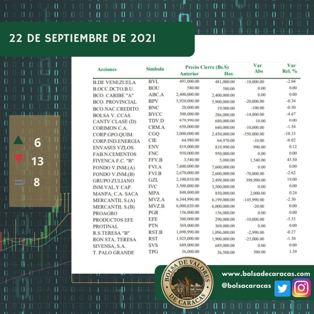 El índice principal de la Bolsa de Valores de Caracas, el IBC, culminó este miércoles en 5.652,31 puntos con una variación de 43,43 puntos (-0,76%) con respecto a la sesión anterior.