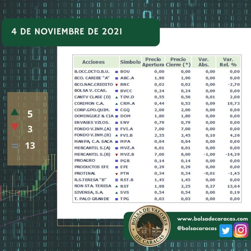 Se efectuaron 127 operaciones de compra/venta de acciones de las empresas inscritas en la pizarra de cotizaciones, en las cuales se transaron 4 millones 226 mil 916 acciones por 115 mil 362 bolívares.