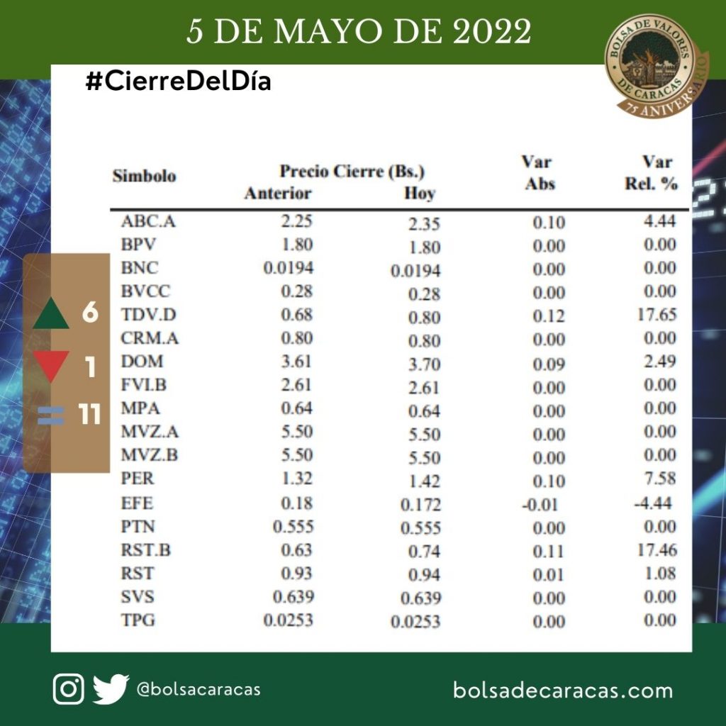 Se efectuaron 52 operaciones de compra/venta de acciones de las empresas inscritas en la pizarra de cotizaciones, en las cuales se transaron 118 mil 107 acciones por 52 mil 755 bolívares.