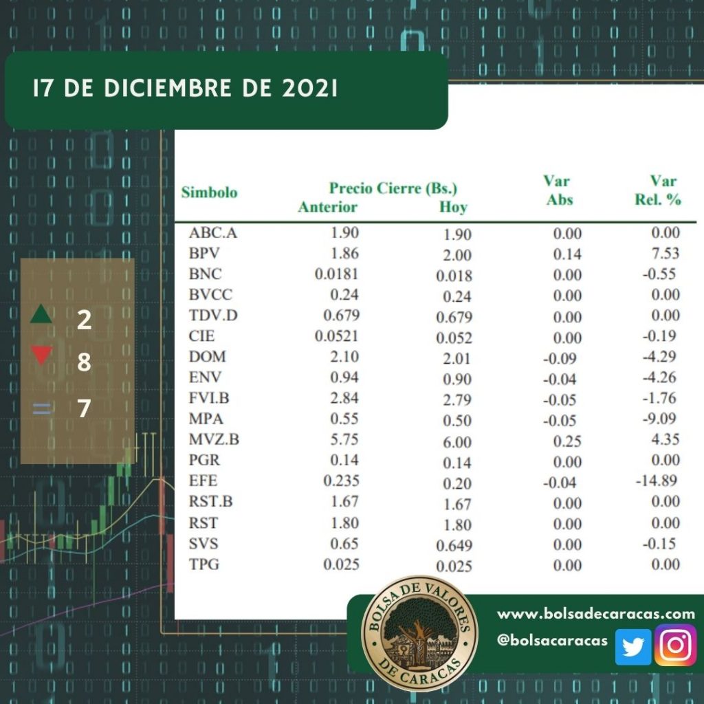 El índice principal de la Bolsa de Valores de Caracas, el IBC, culminó este viernes en 5.713,36 puntos con una variación de 92,57 puntos (+1.65%) con respecto a la sesión anterior.