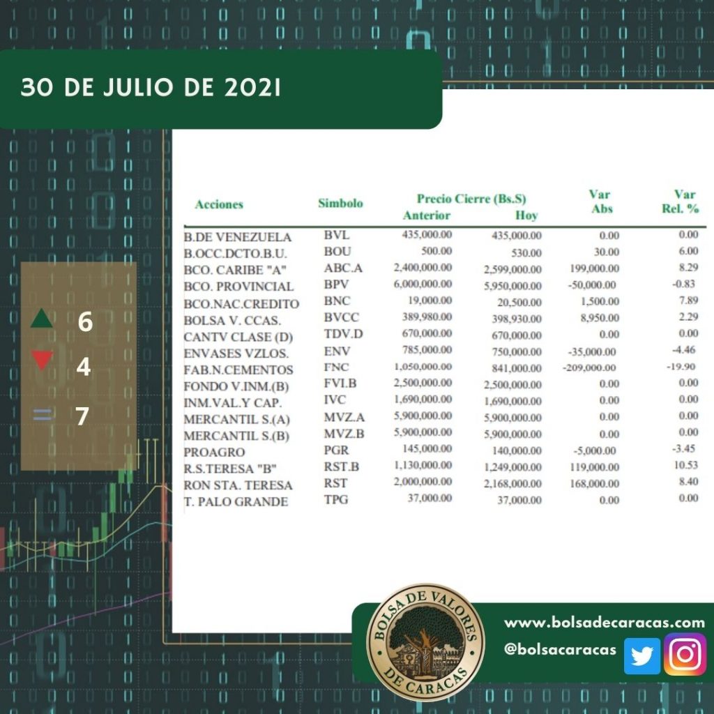 El índice principal de la Bolsa de Valores de Caracas, el IBC, culminó este viernes en 5.733,86 puntos con una variación de 149,39 puntos (+2,68%) con respecto a la sesión anterior.