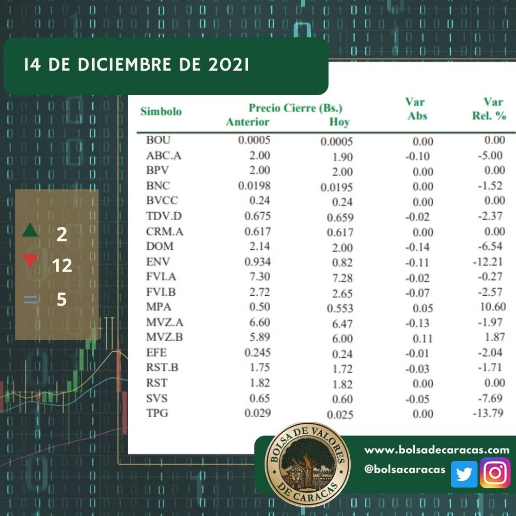 Se efectuaron 98 operaciones de compra/venta de acciones de las empresas inscritas en la pizarra de cotizaciones, en las cuales se transaron 128 mil 062 acciones por 22 mil 222 bolívares.