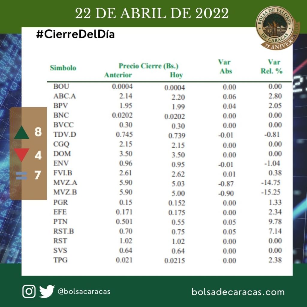 Se efectuaron 93 operaciones de compra/venta de acciones de las empresas inscritas en la pizarra de cotizaciones, en las cuales se transaron 667 mil 964 acciones por 357 mil 104 bolívares.