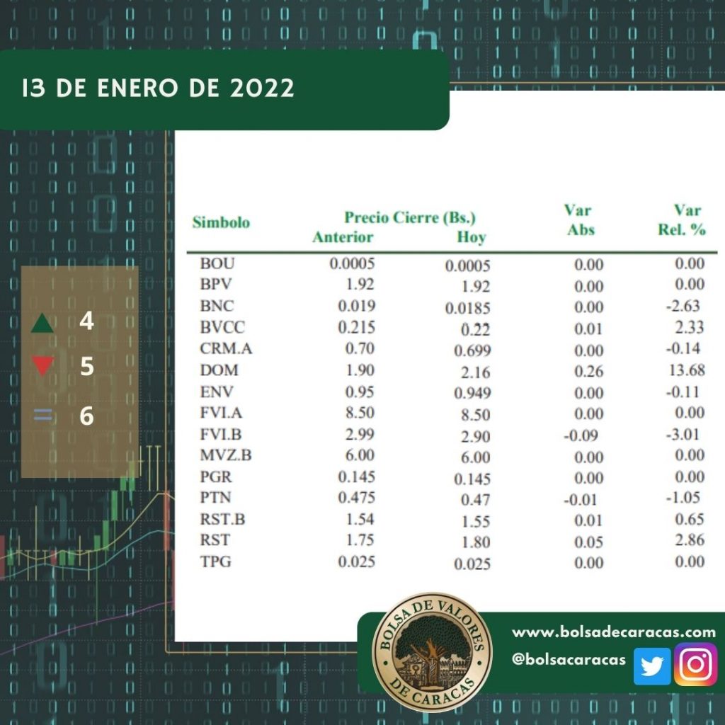 Se efectuaron 90 operaciones de compra/venta de acciones de las empresas inscritas en la pizarra de cotizaciones, en las cuales se transaron 150 mil 820 acciones por 55 mil 402 bolívares.