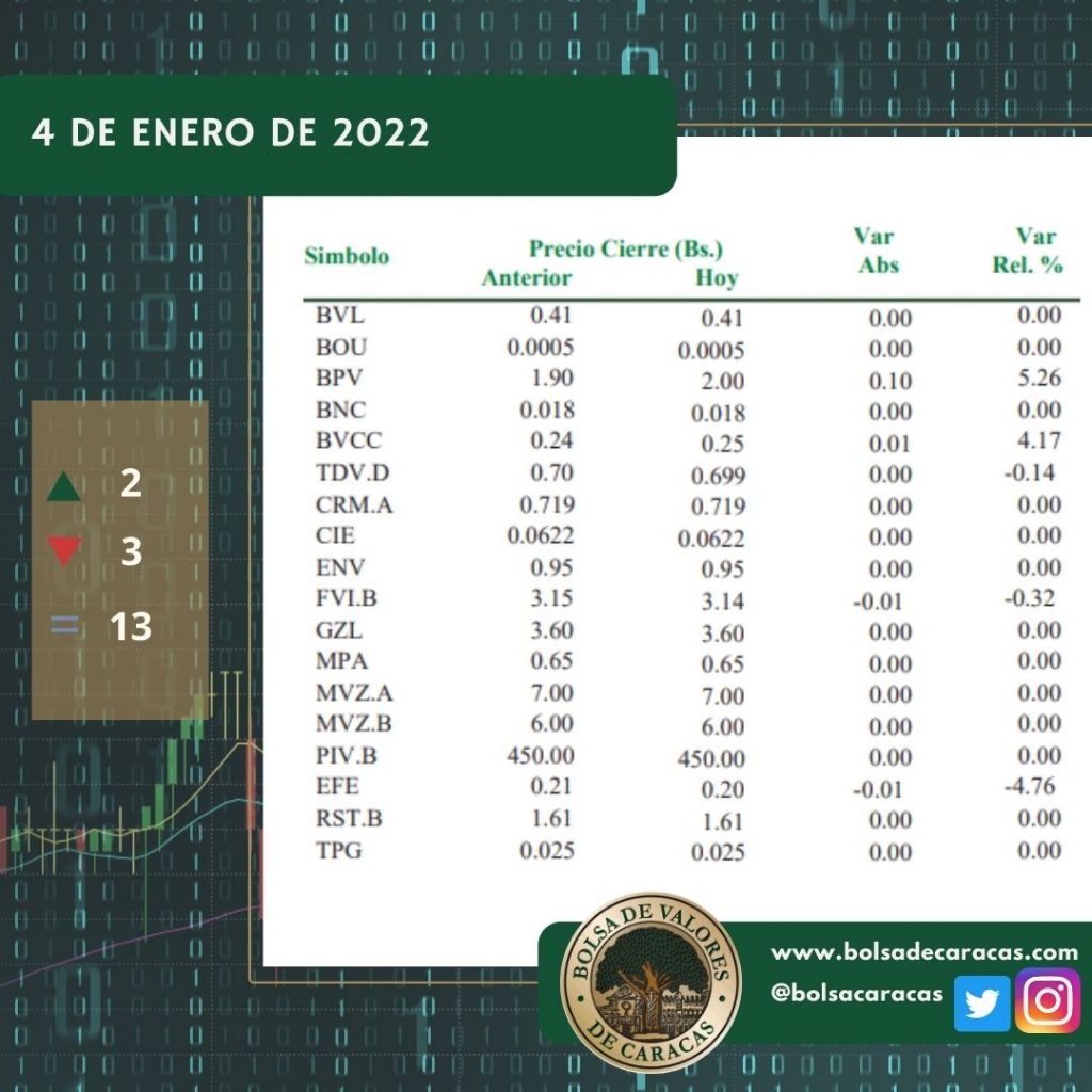 El índice principal de la Bolsa de Valores de Caracas, el IBC, culminó este martes en 5.857,58 puntos con una variación de 75,37 puntos (+1,30%) con respecto a la sesión anterior.