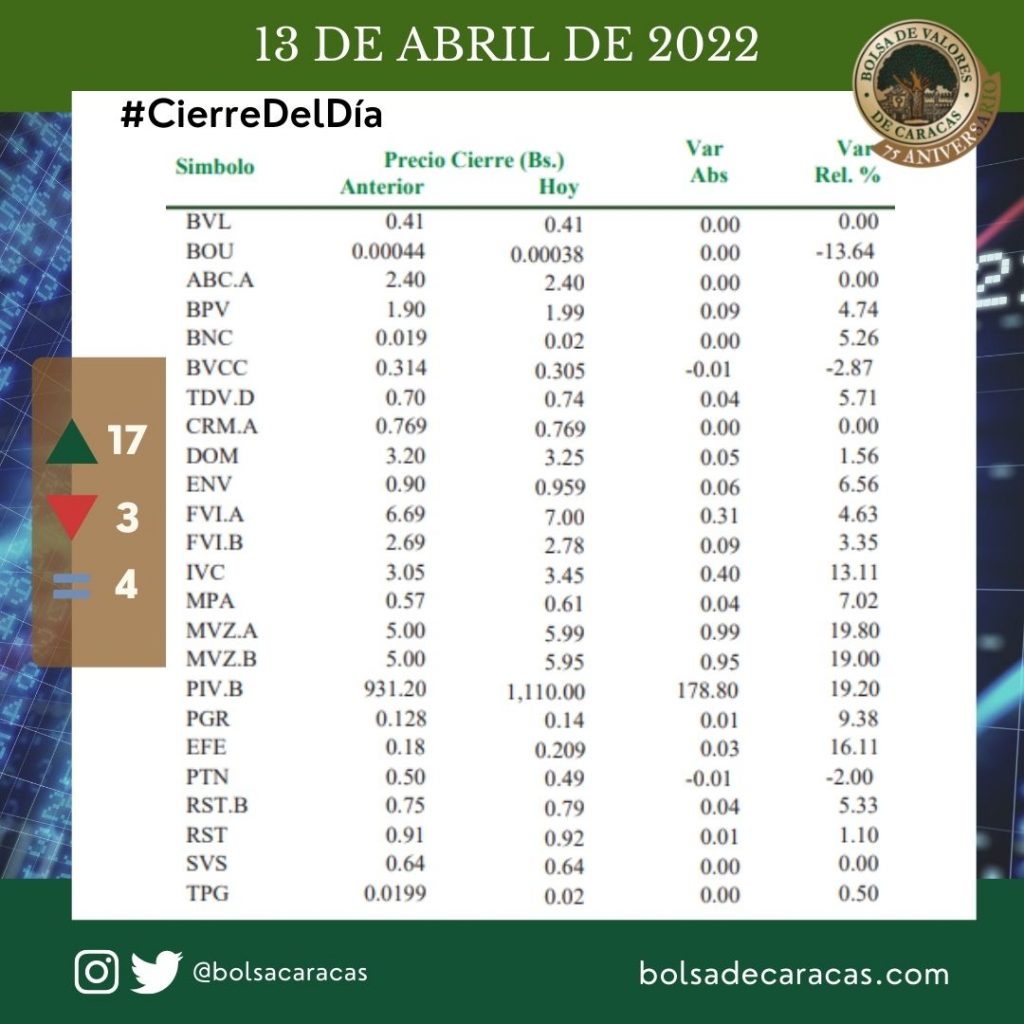 Se efectuaron 168 operaciones de compra/venta de acciones de las empresas inscritas en la pizarra de cotizaciones, en las cuales se transaron 81 millones 129 mil 761 acciones por un millón 409 mil 539 bolívares.