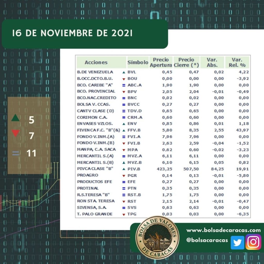 En el mercado a plazo se negociaron 36 mil 380 acciones por un monto de 7 mil 714 bolívares.