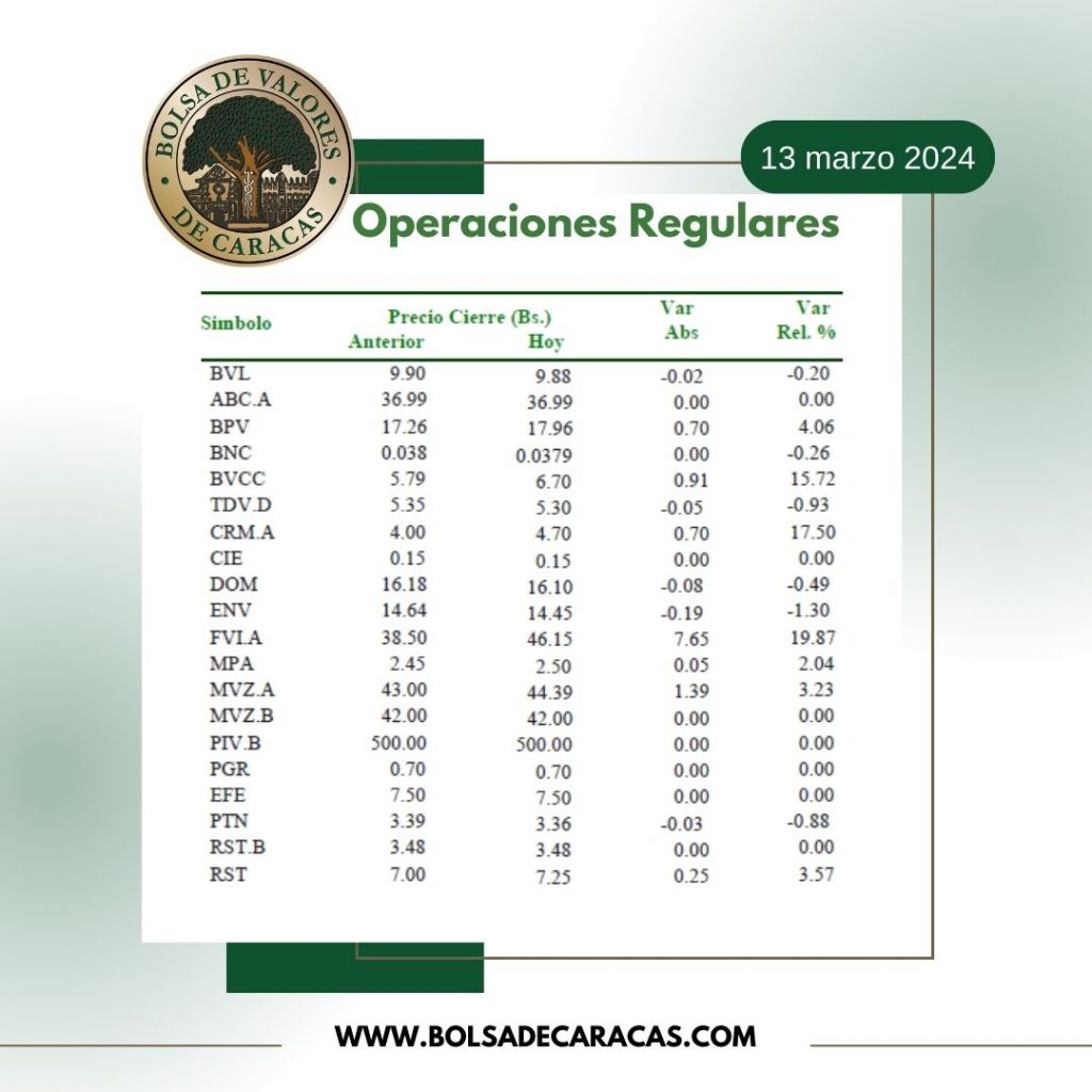 Se efectuaron 128 operaciones de compra/venta de acciones de las empresas inscritas en la pizarra de cotizaciones, en las cuales se transaron 1 millón 071 mil 609 acciones por 1 millón 704 mil 914 bolívares.