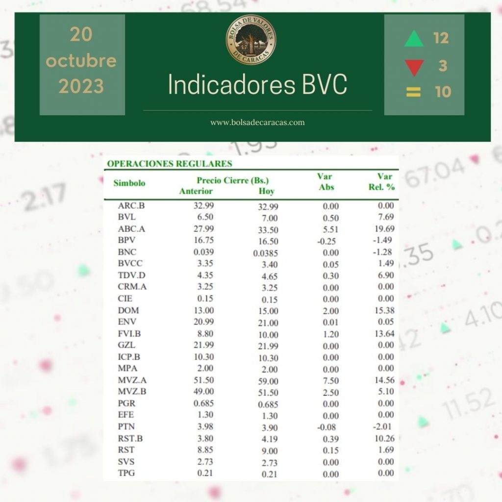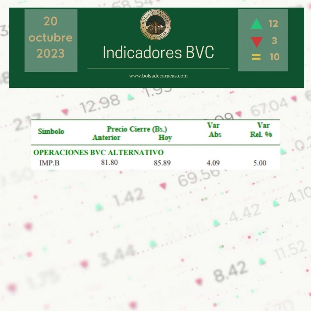 El índice principal de la Bolsa de Valores de Caracas, el IBC, culminó este viernes en 54.964,48 puntos con una variación de 2.041,95 puntos (+3,86%), con respecto a la sesión anterior.