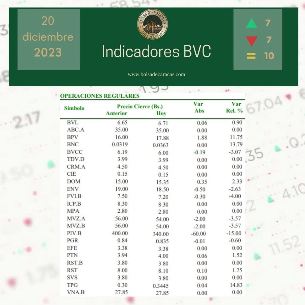 El índice principal de la Bolsa de Valores de Caracas, el IBC, culminó este miércoles en 55.422,46 puntos con una variación de 2.050,90 puntos (+3,84%), con respecto a la sesión anterior.