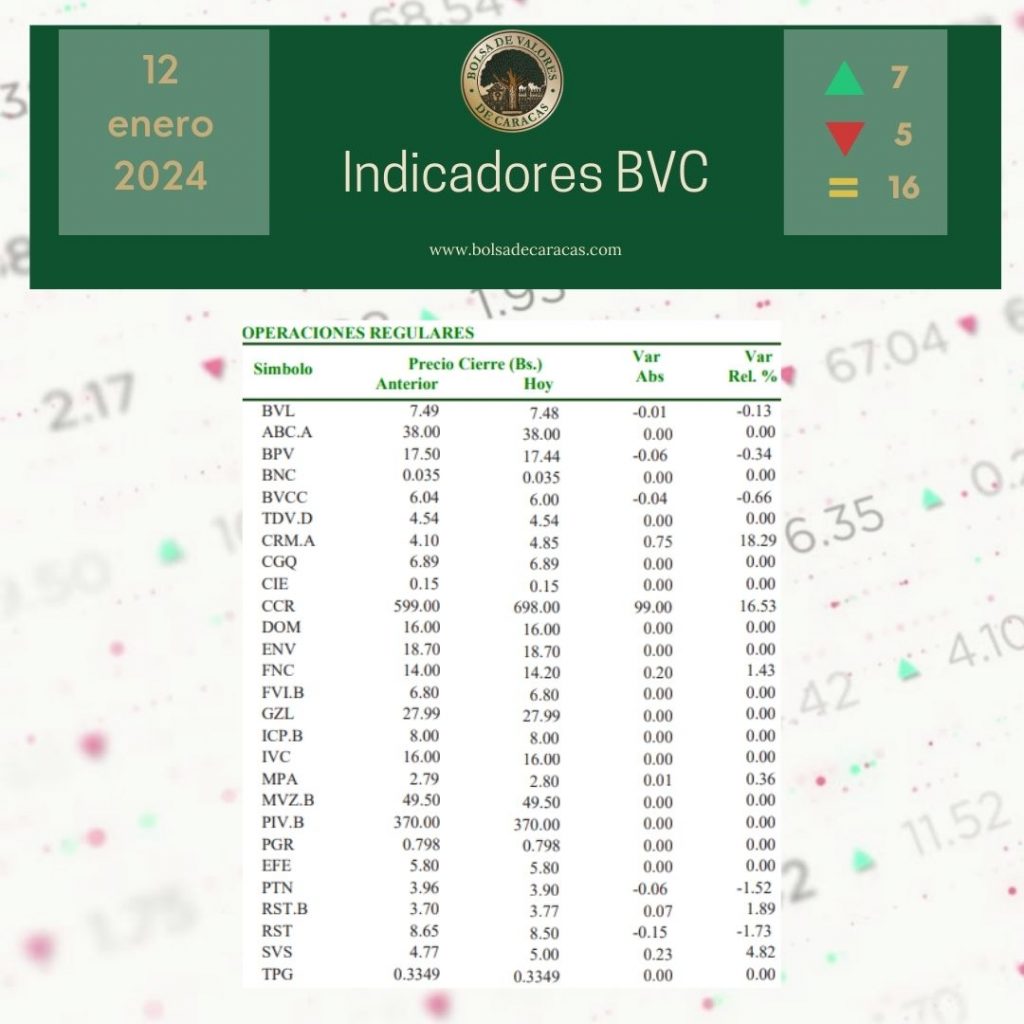 El índice principal de la Bolsa de Valores de Caracas, el IBC, culminó este viernes en 55.899,57 puntos con una variación de 136,67 puntos (+0,25%), con respecto a la sesión anterior.