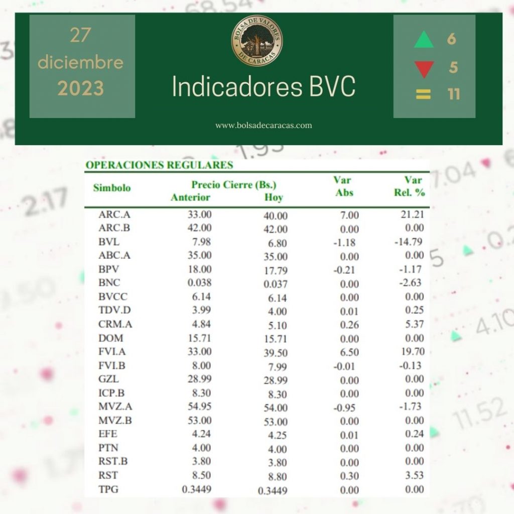 Se efectuaron 106 operaciones de compra/venta de acciones de las empresas inscritas en la pizarra de cotizaciones, en las cuales se transaron 177 mil 045 acciones por 754 mil 722 bolívares.