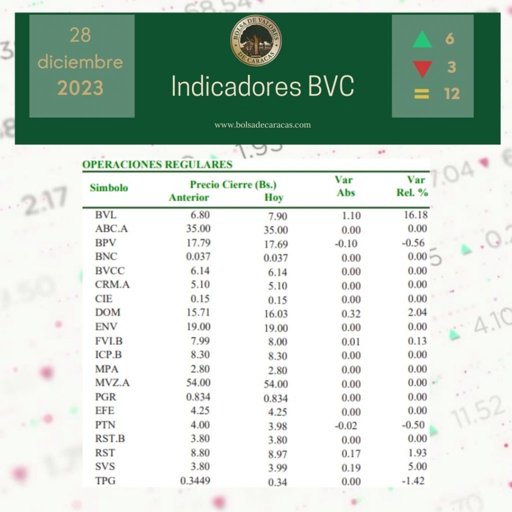 Se efectuaron 113 operaciones de compra/venta de acciones de las empresas inscritas en la pizarra de cotizaciones, en las cuales se transaron 1 millón 482 mil 486 acciones por 1 millón 747 mil 397 bolívares.