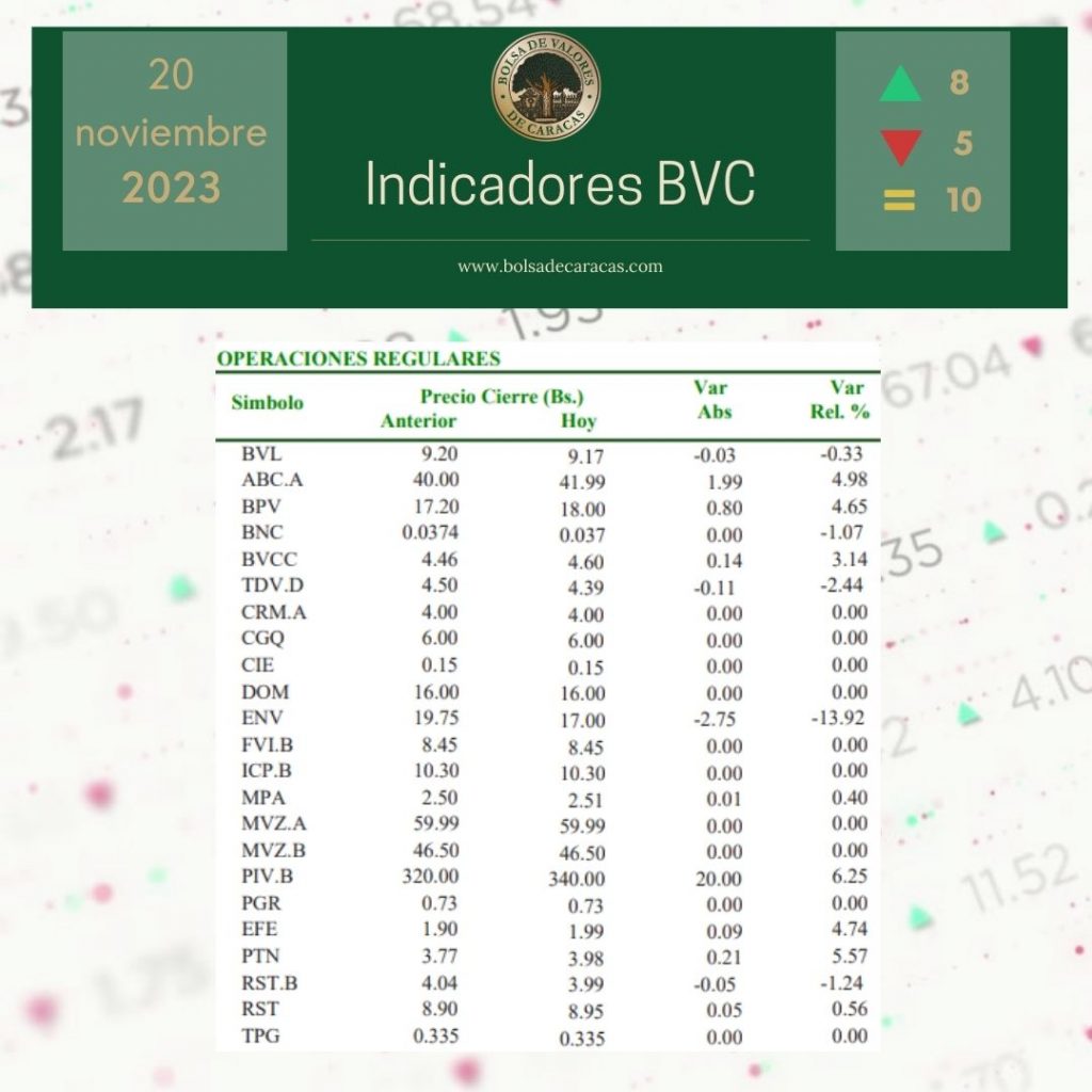 El índice principal de la Bolsa de Valores de Caracas, el IBC, culminó este lunes en 56.688,73 puntos con una variación de 237,30 puntos (+0,42%), con respecto a la sesión anterior.
