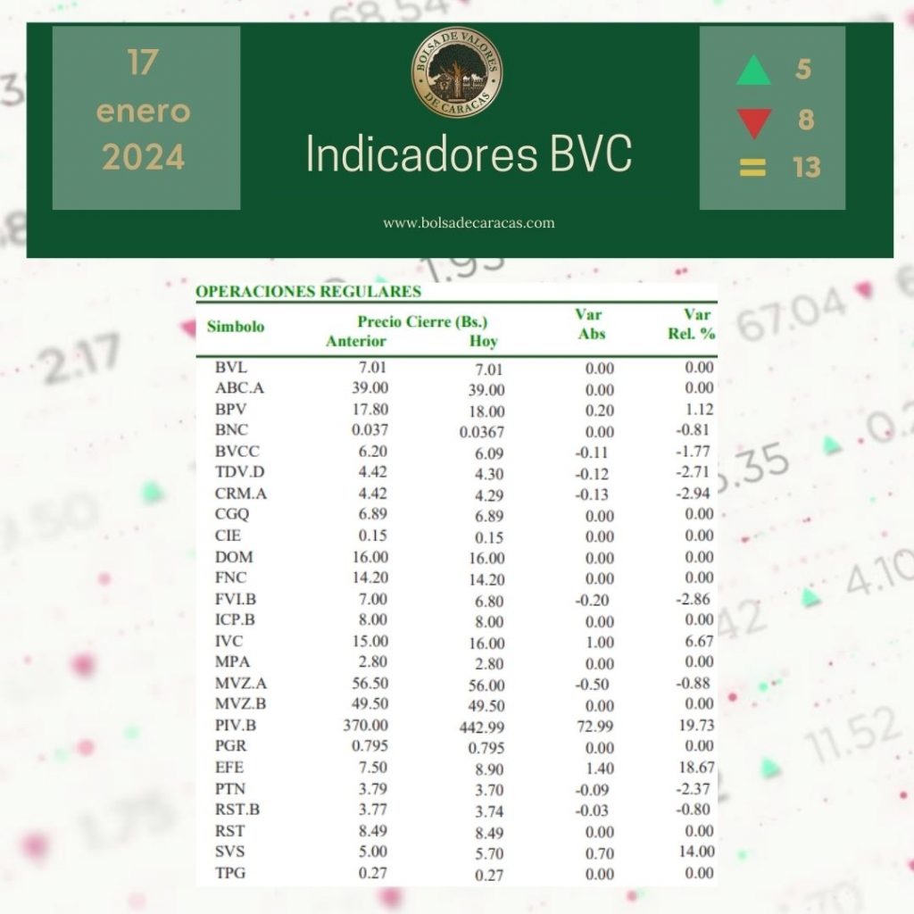 Se efectuaron 132 operaciones de compra/venta de acciones de las empresas inscritas en la pizarra de cotizaciones, en las cuales se transaron 214 mil 277 acciones por 200 mil 765 bolívares.