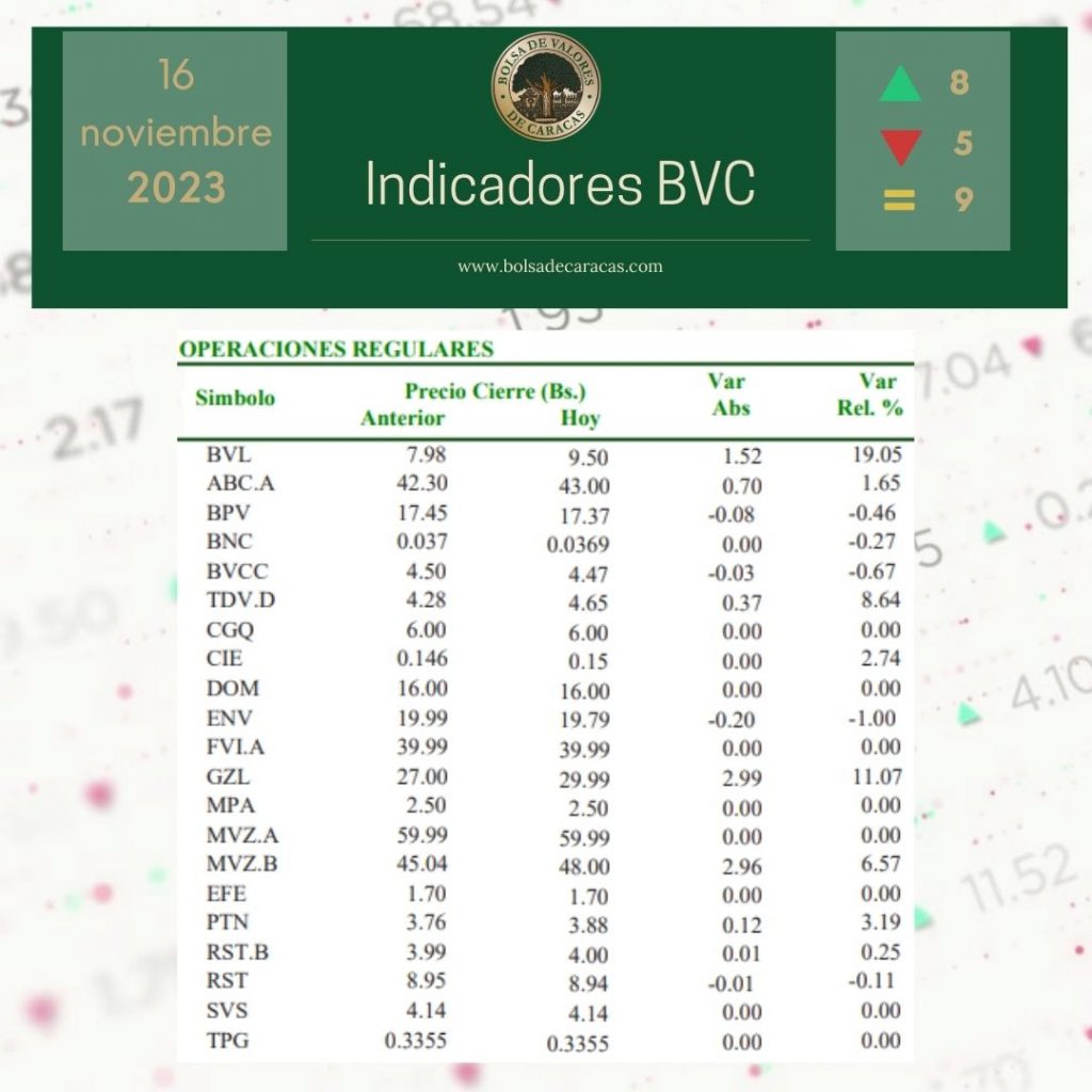El índice principal de la Bolsa de Valores de Caracas, el IBC, culminó este jueves en 57.174,88 puntos con una variación de 231,91 puntos (+0,41%), con respecto a la sesión anterior.