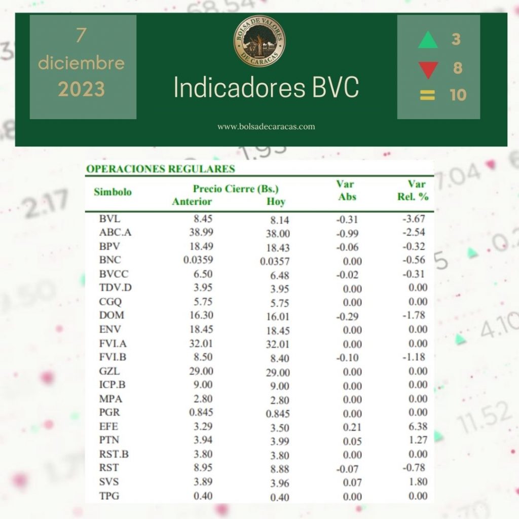 El índice principal de la Bolsa de Valores de Caracas, el IBC, culminó este jueves en 58.009,49 puntos con una variación de 321,83 puntos (-0,55%), con respecto a la sesión anterior.