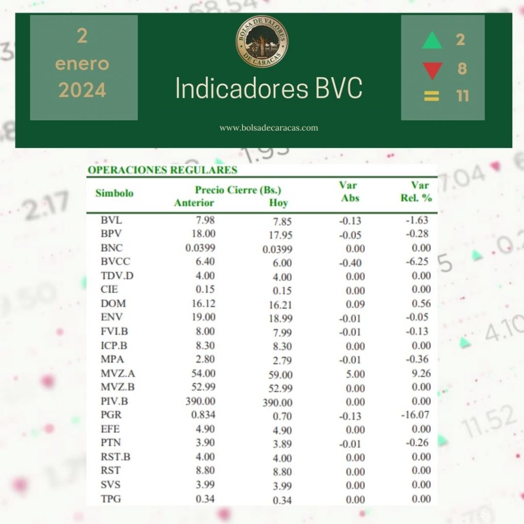 Se efectuaron 72 operaciones de compra/venta de acciones de las empresas inscritas en la pizarra de cotizaciones, en las cuales se transaron 232 mil 189 acciones por 58 mil 415 bolívares.