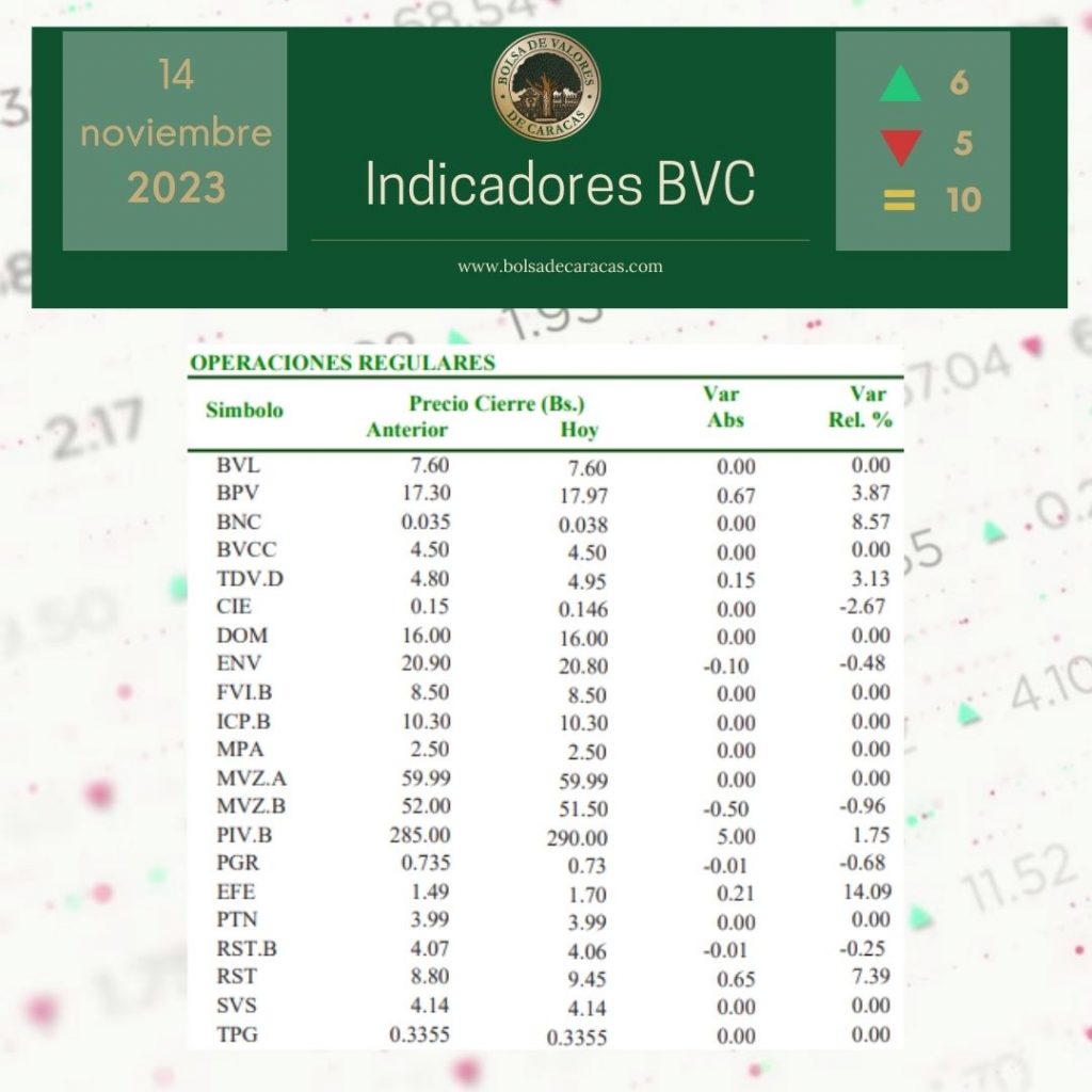 Se efectuaron 130 operaciones de compra/venta de acciones de las empresas inscritas en la pizarra de cotizaciones, en las cuales se transaron 10 millones 740 mil 047 acciones por 986 mil 396 bolívares.