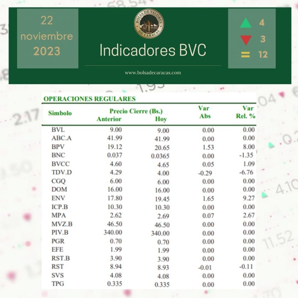 El índice principal de la Bolsa de Valores de Caracas, el IBC, culminó este miércoles en 59.200,71 puntos con una variación de 1.456,14 puntos (+2,52%), con respecto a la sesión anterior.
