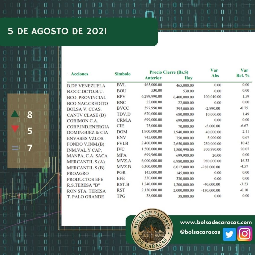 El índice principal de la Bolsa de Valores de Caracas, el IBC, culminó este jueves en 6.006,56 puntos con una variación de 92,68 puntos (+1,57%) con respecto a la sesión anterior.