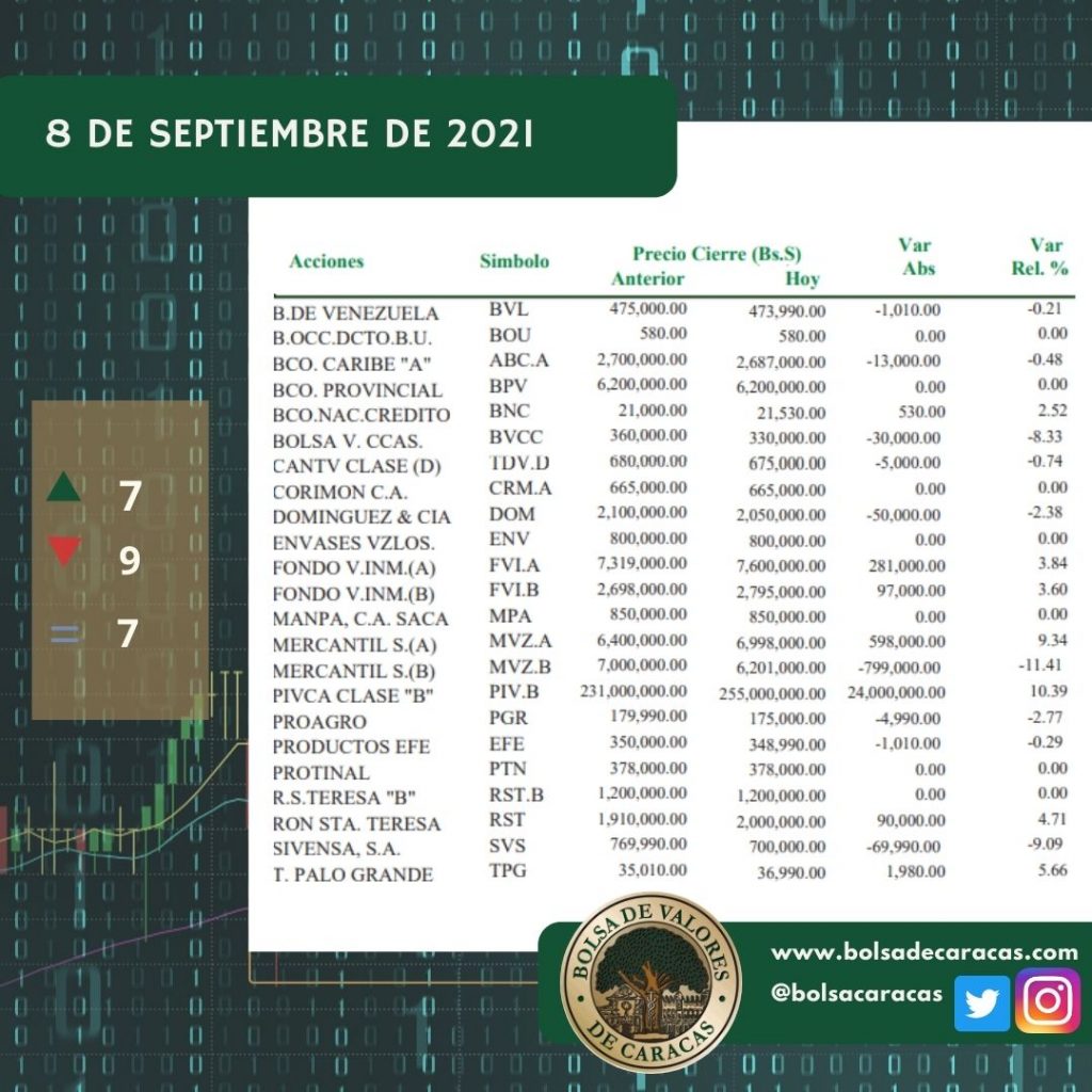 Se efectuaron 171 operaciones de compra/venta de acciones de las empresas inscritas en la pizarra de cotizaciones, en las cuales se transaron 392 mil 576 acciones por 38 mil 935 millones 945 mil 970 bolívares.