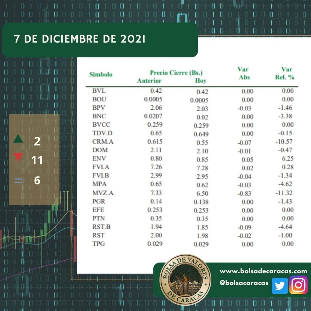 El índice principal de la Bolsa de Valores de Caracas, el IBC, culminó este martes en 6.060,78 puntos con una variación de 182,58 puntos (-2,92%) con respecto a la sesión anterior.