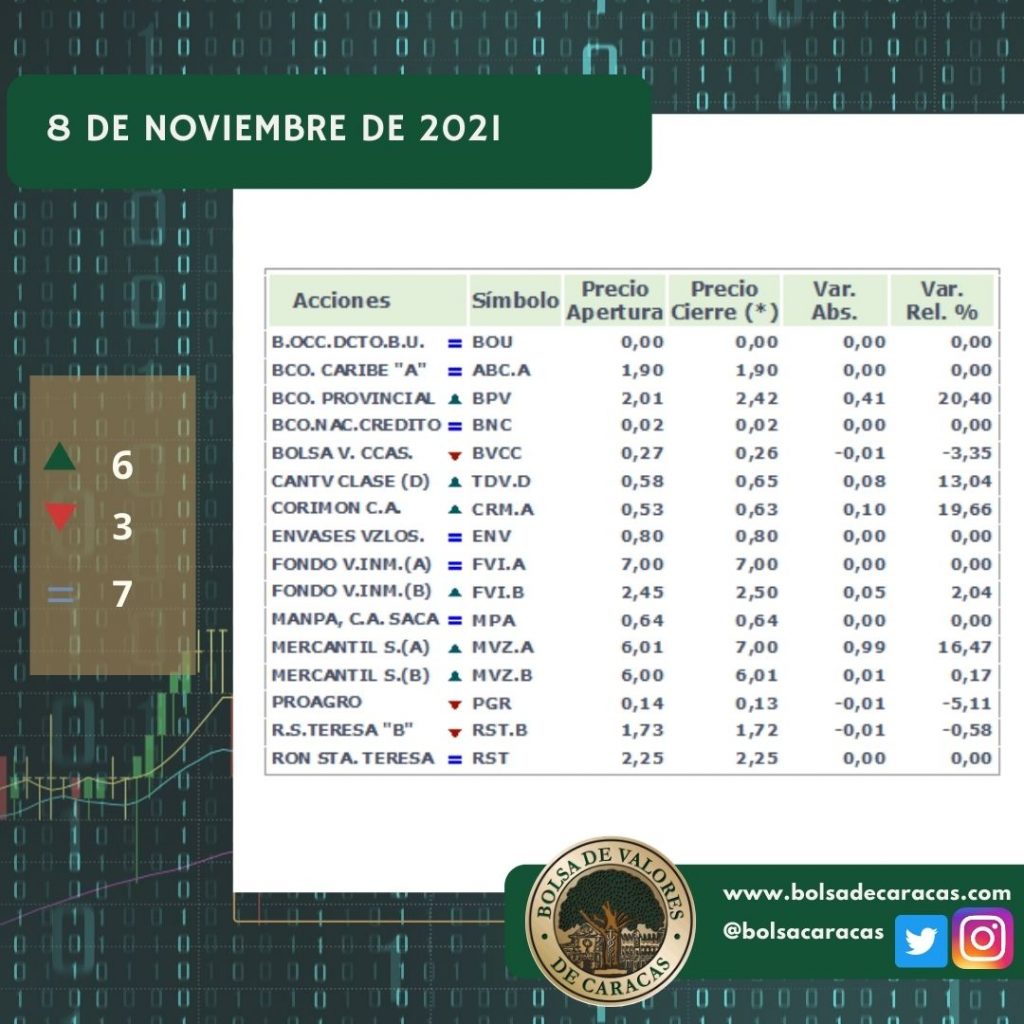 El índice principal de la Bolsa de Valores de Caracas, el IBC, culminó este lunes en 6.316,44 puntos con una variación de 461,21 puntos (+7,88%) con respecto a la sesión anterior.