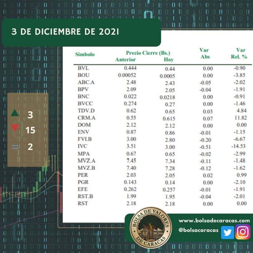 En el mercado a plazo se negociaron 20 mil 421 acciones por un monto de 54 mil 311 bolívares.