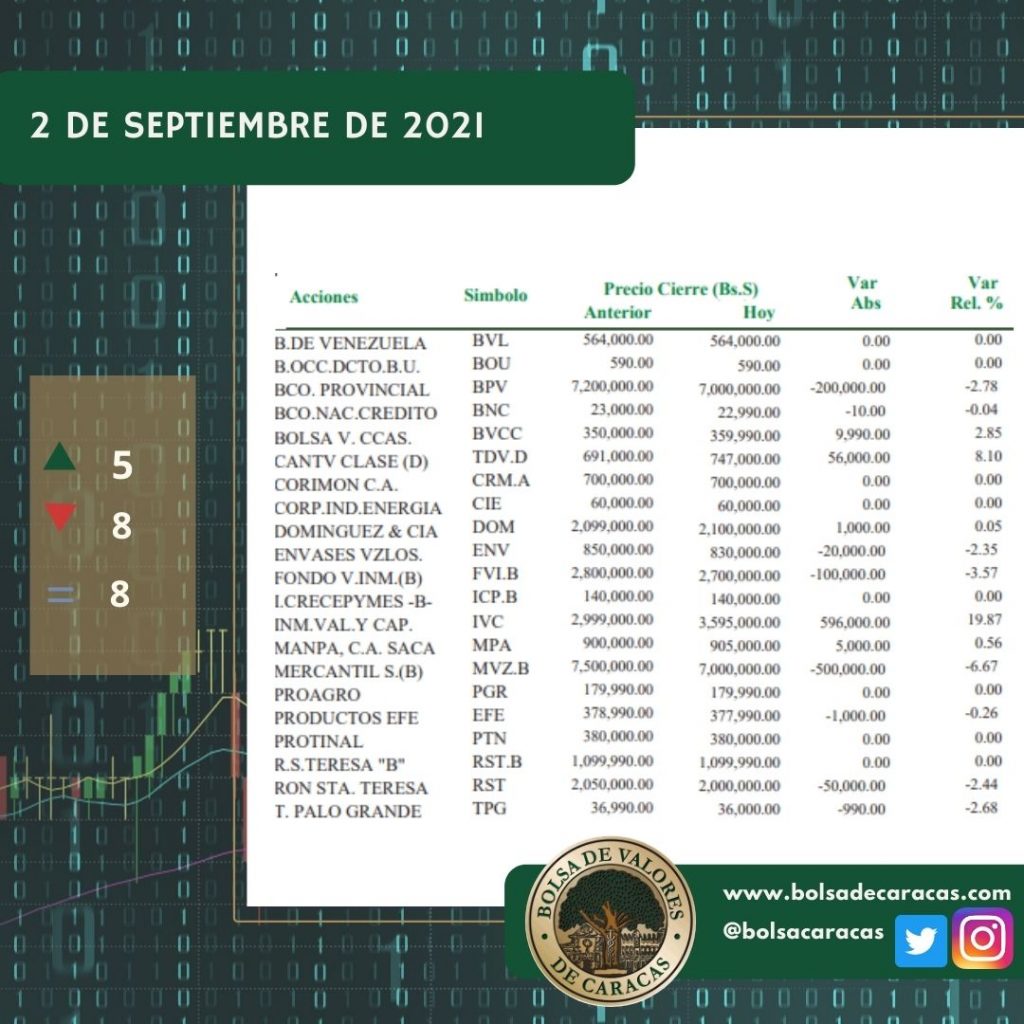 Se efectuaron 132 operaciones de compra/venta de acciones de las empresas inscritas en la pizarra de cotizaciones, en las cuales se transaron 77 mil 932 acciones por 31 mil 555 millones 320 mil 120 bolívares.
