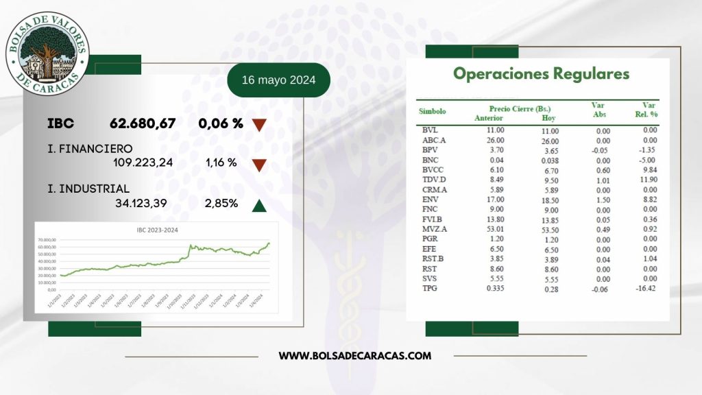 El índice principal de la Bolsa de Valores de Caracas, el IBC, culminó este jueves en 62.680,67 puntos con una variación de 38,69 puntos (-0,06%), con respecto a la sesión anterior.