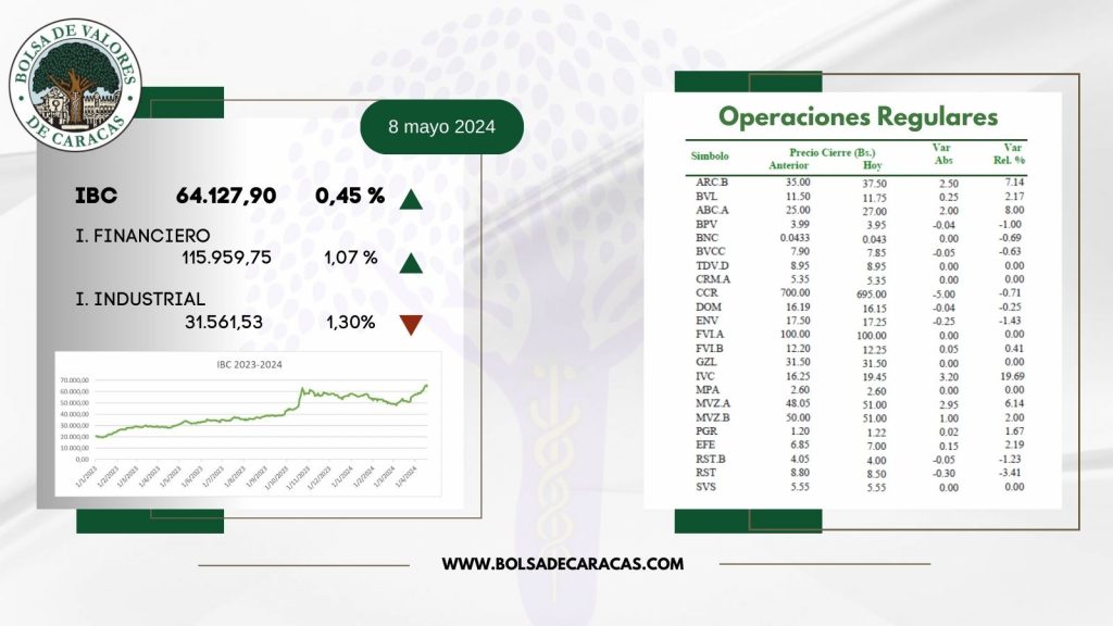 El índice principal de la Bolsa de Valores de Caracas, el IBC, culminó este miércoles en 64.127,90 puntos con una variación de 289,21 puntos (+0,45%), con respecto a la sesión anterior.