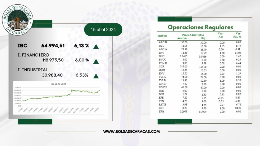 El índice principal de la Bolsa de Valores de Caracas, el IBC, culminó este lunes en 64.994,51 puntos con una variación de 3.755,31 puntos (+6,13%), con respecto a la sesión anterior.