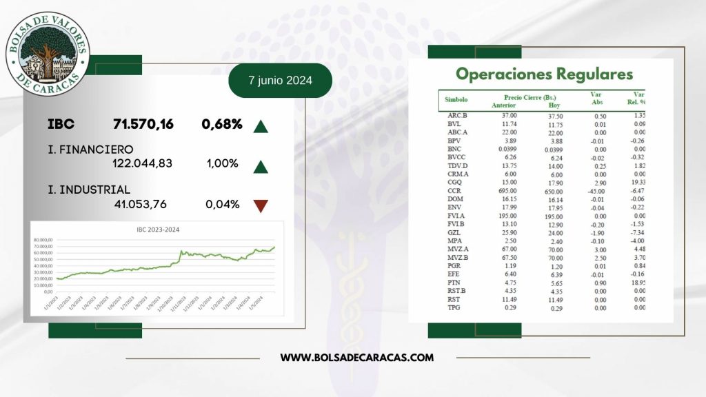 El índice principal de la Bolsa de Valores de Caracas, el IBC, culminó este viernes en 71.570,16 puntos con una variación de 485,25 puntos (+0,68%), con respecto a la sesión anterior.