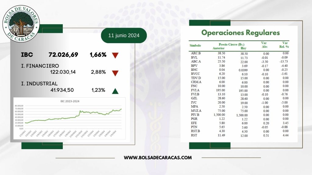 El índice principal de la Bolsa de Valores de Caracas, el IBC, culminó este martes en 72.026,69 puntos con una variación de 1.215,19 puntos (-1,66%), con respecto a la sesión anterior.