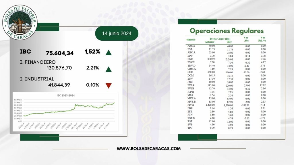 El índice principal de la Bolsa de Valores de Caracas, el IBC, culminó este viernes en 75.604,34 puntos con una variación de 1.134,93 puntos (+1,52%), con respecto a la sesión anterior.